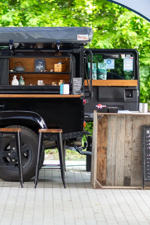 In de voormiddag verwelkomen we L'atitude51 met hun iconische omgebouwde Land Rover Defender, volledig ingericht als mobiele koffiebar.